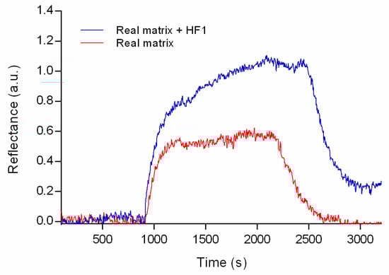 Since black Sigatoka leaf disease has a biotrophic phase, could pass weeks or even months before visible symptoms in the leaves of the banana plants. For this reason, it is necessary to assess and monitor the presence of the concentrations of HF1 in the extracts from the leaves, as indicative of the possible infection by P. fijiensis. Thus, the evaluation of the matrix effects in the SPR based immunoassay is a critical issue to determine its influence on the performance of the method during the analysis of real samples. The presence of certain components in the matrix of a real sample could lead to false positives as a consequence or interfere in the antigen-antibody recognition [22].