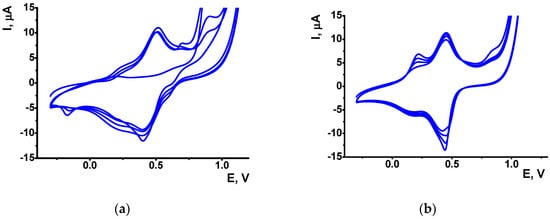 It is interesting to compare the voltammograms recorded in the same conditions before and after intermediate adsorption of native DNA onto freshly deposited PANI layer. The DNA deposition was performed after removal of excessive acid by washing with deionized water to prevent acidic damage of the biopolymer. The comparison of voltammograms (Figure 1a,b) confirms inclusion of DNA in the surface layer. The PANI peaks became higher and narrower than before DNA adsorption. The peak pair at 0.2–0.3 V became more pronounced and increased faster than prior to DNA addition. Below, the electrode covered with such coating is denoted as GCE/PANI/DNA/PANI. Similar measurements performed at higher pH value indicate a sharp decay of the peaks attributed to PANI emeraldine form [28] due to its conversion into leuco-emeraldine with not electroconductivity and redox-activity required for signal transduction. However, at lower pH (below pH 5) the protonation of DNA can change their properties. Certainly, it has been shown that pH changes from 4 to 3 resulted in unstacking of N-7 guanine which rotating out of the helix [38]. Nevertheless, investigation of the effect of protonation of DNA (at pH between 4 and 3) on the interaction of Nitidine chloride clearly demonstrated intercalation of this compound inside the helix [39]. It is also possible that that the entrapment of DNA between aniline layers stabilize the DNA double helix.