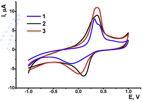 Cyclic voltammograms recorded on GCE/PANI/DNA/PANI prior to (1) and after consecutive 15 min incubation in 0.5 mM Methylene blue (2) and 10 nM doxorubicin (3).