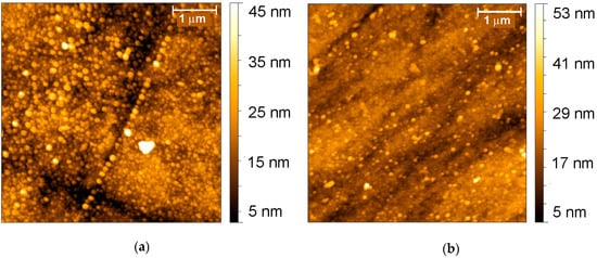 AFM images obtained on polished glassy carbon electrode (GCE) in four (a) and eight (b) cycles of potential in 0.5 M H2C2O4 containing 0.07 M aniline.