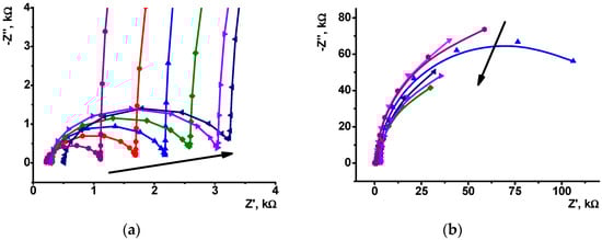 The Nyquist diagram of impedance spectra corresponded to inner (a) and outer (b) interface of the GCE/PANI/DNA (20 μL, 2 mg/mL)/PANI electrode consecutively incubated in 0.1 mM Methylene blue and 0, 1 × 10−5, 1 × 10−6, 1 × 10−7, 1 × 10−8, and 1 × 10−9 M doxorubicin. Measurements in the presence of 0.01 M K3[Fe(CN)6] and 0.01 M K4[Fe(CN)6] at 0.26 V vs. Ag/AgCl. Frequency range 0.04 Hz–100 kHz, amplitude 5 mV. Arrows indicate direction of consecutive increase of the doxorubicin concentration.