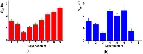 In comparison with voltammetric measurements (Table 1), the LOD of doxorubicin was reduced by more than two orders of magnitude (LOD 0.6 pM). It should be also noted that Ret relative changes on the upper interface are significantly lower and to some extent irregular and do not coincide with the analyte concentration. This confirms the idea that the changes in the EIS spectra are related to the DNA molecules capsulated in the middle of the surface layer. Similar measurements with no Methylene blue treatment (Figure 6b) did not show regular changes of the parameters because doxorubicin being free or incorporated did not exert its ability to electrochemical wiring of the DNA molecules. In both cases, DNA sensors provides a single measurement because the equilibria with participation of capsuled DNA molecules are shifted toward intercalated molecules and their dissociation within a reasonable time interval seems impossible.
