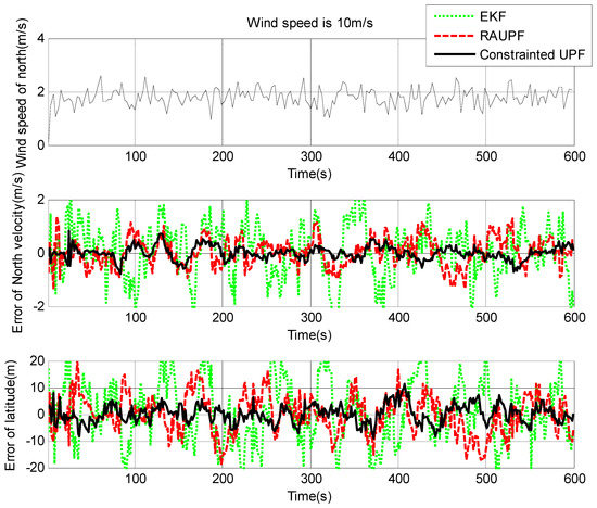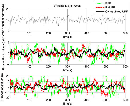 The estimated velocity and position errors under different wind speeds are shown in Figure 3, Figure 4, Figure 5, Figure 6, Figure 7 and Figure 8, and their corresponding mean values are listed in Table 1, Table 2 and Table 3. In the case of 10 m/s constant wind, during the time period from 0 s to 600 s, the velocity and position errors obtained by EKF beyond ±2 m/s and ±20 m, respectively. This is because the linearization of system model causes a large navigation error. RAUPF improves the performance of EKF. The velocity and position errors obtained by RAUPF are within (−0.7 m/s, +0.7 m/s) and (−7 m, +7 m). They are also much larger than those errors by the constrained UPF, which are within (−0.3 m/s, +0.3 m/s) and (−4 m, +4 m). Considering that the performance of EKF is too poor for the wind field disturbance, in the following we shall focus on the comparison of RAUPF with the proposed constrained UPF for the cases of 15 m/s and 20 m/s wind speeds. The similar trend can also be observed for these two cases. In the case of 15m/s constant wind, the velocity and position errors obtained by RAUPF are within (−1.1 m/s, +1.1 m/s) and (−8 m, +8 m), while those by the constrained UPF are within (−0.6 m/s, +0.6 m/s) and (−5.5 m, +5.5 m). In the case of 20 m/s constant wind, the velocity and position errors obtained by RAUPF are within (−1.6m/s, +1.6 m/s) and (−9.5 m, +9.5 m), while those by the constrained UPF are within (−0.7 m/s, +0.7 m/s) and (−6 m, +6 m). Therefore, it is evident that the velocity and position errors obtained by the proposed constrained UPF are much smaller than those by RAUPF.