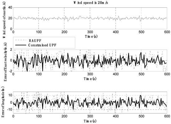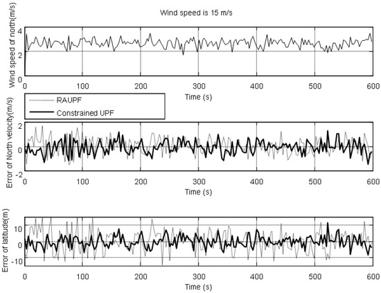 It is also observed that the latitude and North velocity errors are smaller than the longitude and East velocity for RAUPF. The reason is that the gust wind is in the North by East 10° and thus its East velocity component is larger than its North velocity component, more greatly affecting the East velocity and longitude of the airship. However, the constrained UPF does not suffer from such an effect caused by the wind field disturbance. The North velocity and latitude are in the similar accuracy as the East velocity and longitude, without any obvious disturbance by the wind field. This demonstrates that the proposed constrained UPF is able to resist the disturbance of wind field.