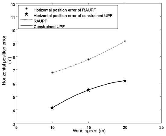 In addition, only a slight change in the accuracy of the constrained UPF was observed due to the increase of wind speed. This means that the ability of the constrained UPF to suppress wind field disturbance becomes stronger with the increase of the wind speed.