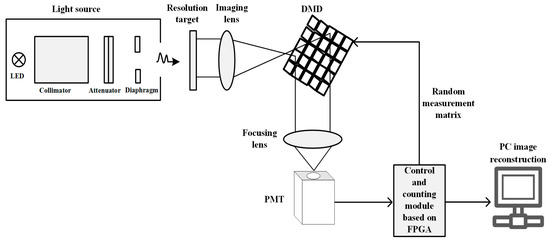 Schematic diagram of single photon compressive imaging system, including a light source, a resolution target, an imaging lens, the digital micromirror device (DMD), a focusing lens, the photomultiplier tubes (PMT), the specially designed circuit for the control of the DMD and counting photons synchronously, and a computer for image reconstruction.