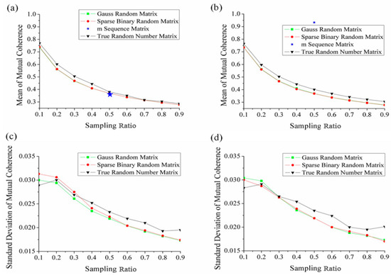 Since the size of matrix can’t be changed, the results of the m sequence matrix are given only when the compressive sampling ratio is 0.5. As shown in Figure 2a,b, for the other three types of measurement matrices, the mean of mutual coherence decreases with the increase of sampling ratio. Especially in Figure 2b, when the sampling ratio is 0.5, mutual coherence corresponding to m sequence matrix is 0.9329, which is significantly greater than that of the other three measurement matrices. The mutual coherence of the sensing matrix composed of Gauss random matrix and sparse binary random matrix at different sampling ratio is basically the same (the dotted lines in the figure overlap), and it is less than that of true random number matrix. Figure 2c,d shows the standard deviation of mutual coherence corresponding to true random number matrix is larger when the sampling ratio is greater than 0.3.