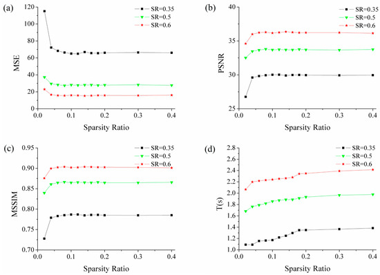The effect of matrix sparsity ratio on its performance. With sampling ratio of 0.35, 0.5, and 0.6, the parameters MSE (a), PSNR (b), MSSIM (c) and reconstruction time T (d) change with sparsity ratio of measurement matrix. Each group of experiments is repeated 500 times.
