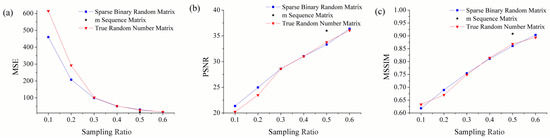 The corresponding curves of evaluation indices with the changing compressive sampling ratio. (a) The MSE of reconstructed image with the changing compressive sampling ratio. (b) The PSNR of reconstructed image with the changing compressive sampling ratio. (c) The MSSIM of reconstructed image with the changing compressive sampling ratio.