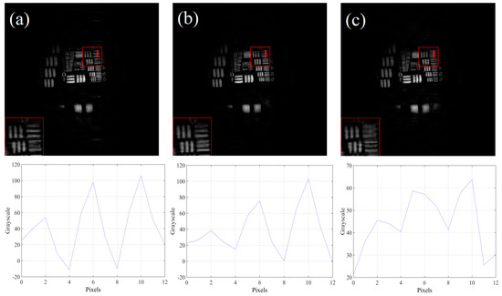 Comparing reconstructed images in Figure 6, the resultant reconstruction of the sparse binary random matrix and the m sequence matrix is better than that of the true random number matrix. Combined with the corresponding grayscale curves, it indicates that the pair of lines on the reconstructed images under the sparse binary random matrix and the m sequence matrix can be resolved. However, under true random number matrix, the corresponding pair of lines can’t be resolved and the discontinuity of grayscale change appears.