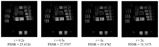 As can be seen from Figure 7, the quality of reconstructed images is improved with the extension of measurement time t, which can also be confirmed by the PSNRs. So the experimental results perfectly verified the above conclusion given by Equation (9).