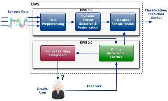 To sum up, the architecture of the DIVS data pipeline is shown in Figure 1. The four major processes are as follows: (1) Data pre-processing, which has the role of preparing the incoming sensor data for further processing by smoothing noisy data, identifying and removing outliers, and resolving data inconsistencies; (2) Dynamic sensor selection and featurization, which makes use of information gain in order to identify the most suitable sensors, possibly reducing the dimensionality of the data and/or introducing additional statistical features (e.g., variance, FFT, etc.), as well as allowing DIVS to operate in a dynamic environment; (3) Online Incremental Learner, which is responsible for ensuring an open-ended learning procedure, capable to incorporate new data in order to improve the DIVS performance; (4) Active Learning, which fosters the interaction with users or other DIVS, by allowing it to obtain labelled data, while at the same time minimizing the amount of queries to the user.