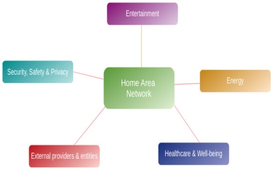 As outlined in Figure 1, the first important service in a smart home is the Entertainment domain. It is regarded as the variety of devices located in the smart home that provides comfort, joy and relax. The main types of smart devices on the market that deliver this kind of service are multimedia (such as smart TVs, and connected speakers), hubs and controllers that help in controlling the gadgets and appliances in the house, lighting (e.g., intelligent dimming for energy savings) [2,3] and heating/cooling through smart thermostats that can bring further energy savings [4]. Such services, in particular the multimedia related ones, requires a higher network demand for low-latency, high-capacity, real-time and high Quality of Services (QoS). What is more, they consume most of the network bandwidth and require higher processing and storage resources.