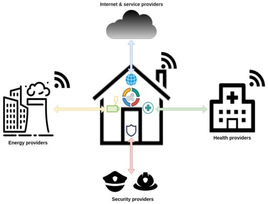 The third-party providers are added in order to connect the smart home with the different entities and service providers in the city. It can be also seen as a tentative to build a smart city network, where each smart home is connected to the different smart facilities of the city. For instance, and as we will explain later, a connection to the healthcare provider can be established to allow for quick interventions in emergency situations, as well as another service for weather forecasting, used by the EMS to estimate the daily consumption profile.