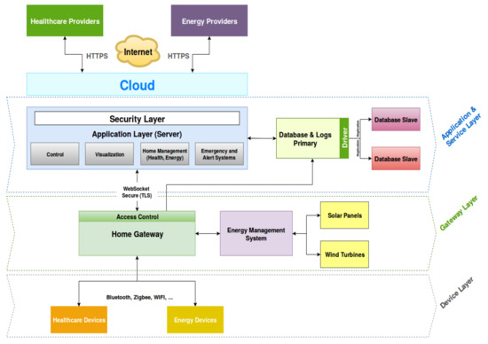 - A layered smart home structure is proposed where security as a priority is implemented at the application level by encrypting all the traffic flowing between different components. The smart home architecture provides as an initial step two types of services, which are the energy management and the healthcare management services, toward the management of all the other services that can be present in the smart home in an intelligent way.