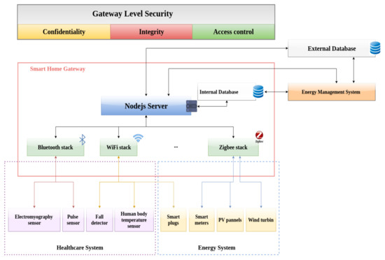 The interoperability issues can be solved, by using a secure gateway, implementing the main communication stacks in order to be able to communicate with all the devices. The gateway also acts as a data aggregator that processes data traffic coming from different devices in the home network, independent of the means of physical transmission, i.e., wired or wireless. Since the gateway is able to communicate either by using a wireless communication protocol (i.e., Zigbee, Bluetooth, etc.) or by using Ethernet directly linked to the devices. The data provided by this gateway will be then sent to the application server.