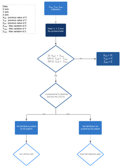 In our demonstration, a three-axis accelerometer ADXL330 board is used. Additionally, a simple algorithm, represented as a flowchart in Figure 5, is used in order to detect quick variation of one of the values of the accelerometer (X or Y or Z axis), and upon exceeding of a certain limit, an alert is generated and sent from the controller to the application. A LED is lit when a fall is detected. Additionally, a button also can be used in order to prevent fault positives, where the user is given 30 s to push the button in case of normal movement. A calibration function is used in order to detect the maximum values of each axis of the accelerometer. The value in this case are collected every 1 millisecond, as long as the calibration button is pushed, and usually it takes up to 1 s to get the maximum values for each axis. Generally, the accelerometer values are collected each 2 s.