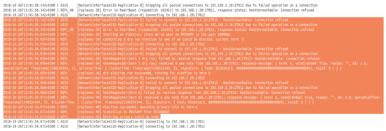 Database fault tolerance: the architecture implements the NoSQL database MongoDB. To provide more reliability to the system in particular regarding the data provided by the different sensors of the smart home, we used what is called “replica set” in MongoDB. As defined in Ref. [41], “A replica set in MongoDB is a group of mongod processes that maintain the same data set. Replica sets provide redundancy and high availability, and are the basis for all production deployments”. In practice, replication provides redundancy and increases data availability, and to be able to recover in case of a disaster. By creating multiple copies of data on different database servers, replication provides a level of fault tolerance against the loss of a single database server, in addition to better performances, increasing data locality and availability in particular for distributed services. The implantation used the master-slave (primary-secondary) replication, as shown in Figure 3, where the primary server receives all the writes and reads requests, and then replicate the data to the slaves. In the same way, if a primary node is down a reelection is triggered between the members of the replica and if possible, a new primary is selected. The Figure 7 and Figure 8 show this behavior of the primary database and the secondary one respectively when the primary server is down.
