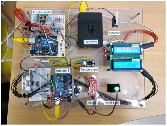 On the wellbeing part, a PoC e-Health platform was developed as shown in Figure 11. This system can be used by the patient on a daily basis to monitor his/her health state. It contains several sensors in order to measure the vital signs of the patient. These sensors are connected to two Arduinos UNO. The Arduino 1 measures the heart rate of the patient and the muscle activity. It also includes an ultrasound sensor that detects the presence of the patient next to the platform. The system shows the heartbeat frequency using the green led while the red one shows an abnormality on the patient pulse. The Arduino 2 is responsible for measuring the body temperature and the acceleration in order to detect a fall. The system is connected to an actuator that simulates an alarm based on an abnormal body temperature. It also includes a red led that indicates a fall alarm, which can be reset by means of the provided button. Moreover, two LCD displays are included to provide the user with a local interface.