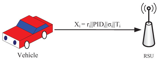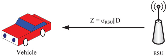 - The RSU computes its signature , where . Then, it broadcasts to the vehicles, as shown in Figure 6.