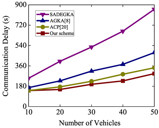 Figure 7 depicts the whole delay in group key negotiation, which includes computation delay and communication delay. In the simulation, we statistically analyzed the average delay of n vehicles initiating the negotiation group key. As shown in Figure 7, with the increase of the number of vehicles, the number of channel collisions increases, thereby increasing the communication delay. The communication efficiency of our scheme outperforms other ones, since the computation delay of our scheme is lower than that of other ones. When a new vehicle enters the communication range of RSU to apply for a new session key, the vehicle only needs to send its own group identity and signature to the RSU. Other existing n vehicles do not need to resend their pseudo identities and signatures again. The RSU computes a new group key according to the newly added vehicle information and broadcasts it. In this procedure, only messages are exchanged. Thus, this phase only requires two rounds to update group key. When a vehicle leaves the communication range of some RSU, the RSU only needs to recalculate the group key based on the information about the remaining vehicles. In this procedure, only messages are transferred. This phase only requires one round in updating group key.