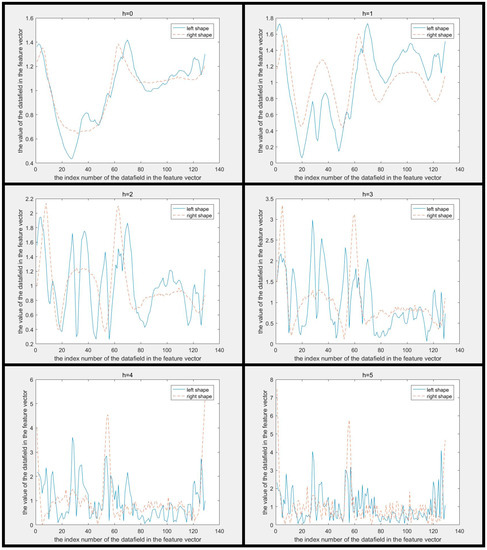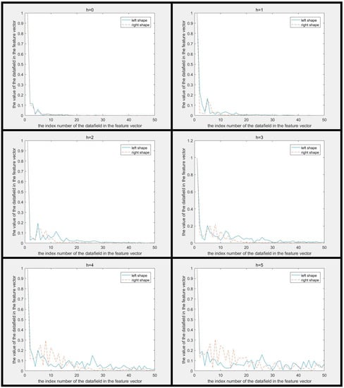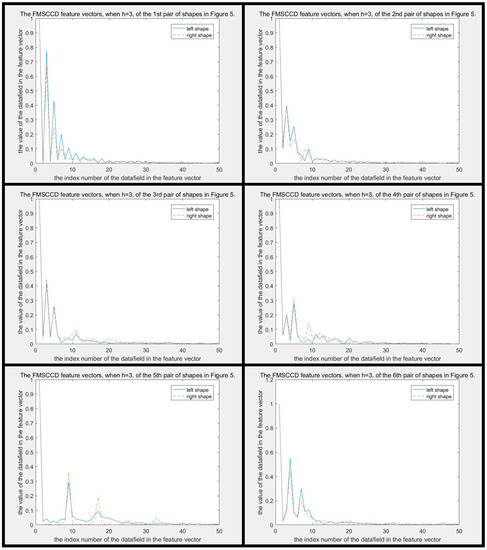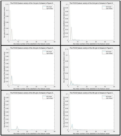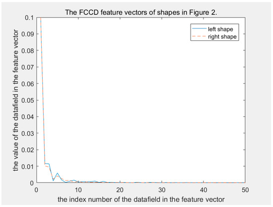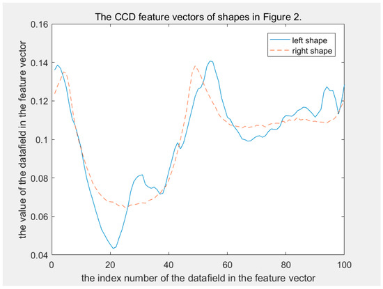 In terms of discriminability, CCD and FCCD have the same weakness, as FCCD is derived from CCD. Human eyes can easily distinguish between two shapes in Figure 2. However, the CCD method does not. In the CCD feature space, the distance between the two shapes in Figure 2 is 0.1007, which is significantly less than . This makes them extremely easy to be judged as in the same class. Figure 3 shows their CCD feature vector curves; it can be seen that their feature vectors are so similar. Figure 4 shows their FCCD feature vector curves that are still so similar. What caused this error? This is because is a distance scalar without direction. The direction information of the contour points relative to the centroid point is lost during calculation of , which results in different shapes having similar CCD feature vectors. The FCCD feature is derived from the CCD feature, so it also inherits this error description.