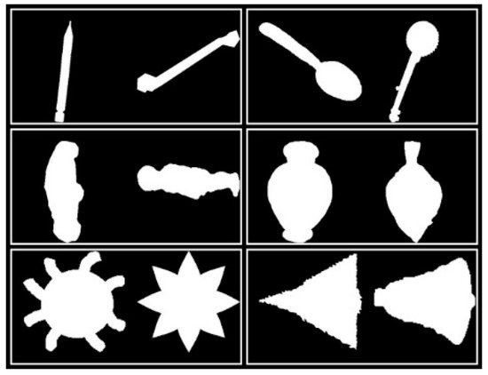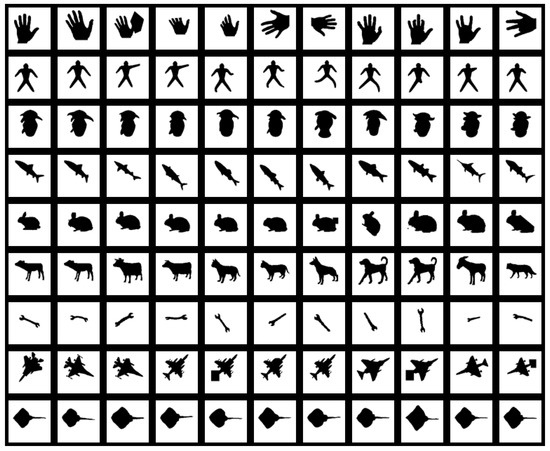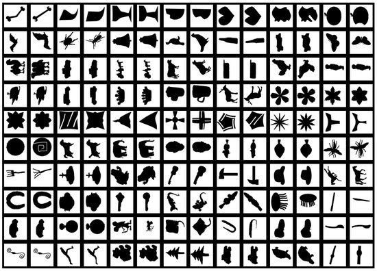 MPEG-7 CE1 Part B is a common shape database used by a large number of shape descriptors in articles [8,10,11,16,17,18]. It contains 70 classes, each containing 20 shapes, so a total of 1400 shapes are in this database. Some examples in the database are shown in Figure 12.