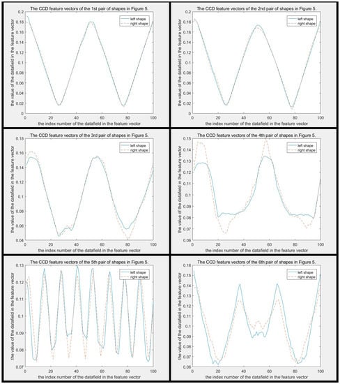 In addition, the CCD method still has a more serious problem in that it is too poor to describe the detail of the contours. In Figure 5, the distance between each pair of shapes is larger than 0.0277 and smaller than 0.0907, which are all smaller than . Therefore, the CCD method cannot identify the difference between each pair of shapes in Figure 5. Why cannot the CCD method distinguish? Because the differences between them are local, but the CCD method is more concerned with global features. The difference between each pair of CCD feature vectors is shown in Figure 6. It can be seen that two CCD feature vectors of each pair of shapes are similar globally, though they are in different classes. These small local differences cause two shapes to be completely in different classes, but unfortunately small local differences do not obviously increase the distance between two shapes in the CCD feature space. The difference between FCCD features of each pair of shapes is shown in Figure 7. The situation is similar to that in CCD. When the CCD method and Fourier transform are used in combination, the discriminability is not substantially improved, though the efficiency of FCCD is much higher than CCD.