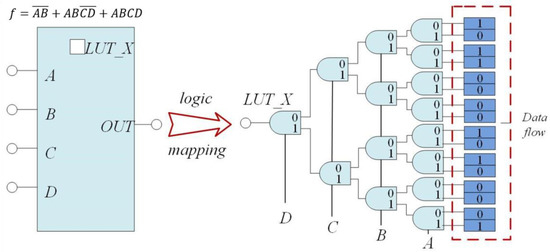 There are different types of IP cores at various design levels, as identification information can be inserted at any design level as a part of the IP core for protection [21,22]. FPGAs are programmable integrated circuits, and the process to insert identification information in such a circuit as a target is more complicated than that of traditional multimedia—text, software, among others. There are lots of configurable logic blocks (CLB) in an FPGA device, as each CLB includes several slices and some inner connections. LUTs in each slice can be configured as specific logic functions, and as a LUT is unused, we can insert specific data without affecting the performance of a design so that it can be used as the carrier of a watermark. Figure 2 shows the LUT configured as a logic function . With a specific input within 0~15 range, the corresponding result of the function is outputted.