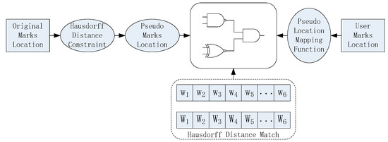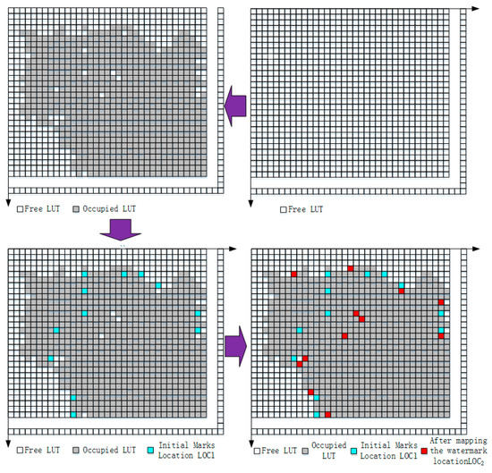 (2) Position mapping. The positions selected by (1) should be further mapped with Definition 2, and the distribution of the identification data is shown in Figure 4. Selected LUTs with Equation (8) are different from the initially selected positions. The Hausdorff distance matching algorithm is used to verify the mapped positions of the identification data. If the Hausdorff distance falls into the range ε, the set of the mapped positions is denoted by LOC2. Otherwise, the selected positions cannot be used for identification data insertion and should be selected again.