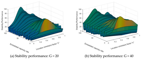 Regarding stability, Hausdorff distance is used to determine the virtual positions for identification of data insertion. Under the control of coefficient ε, virtual positions will be distributed among the functional resources. This addresses the issue that attackers can find the real positions of identification data by analyzing attacks. Besides, the initial positions are further mapped to ensure security. The initial positions are stored in the key file, despite the real positions for inserting the identification data are the mapped ones. Even if the attacks retrieve the key file and extract the initial positions, it cannot determine the real positions of identification data. The Hausdorff distance constraint function is used to match the LUTs and make the inserted identification date secure. As the copyright needs authentication, the user can apply for the authentication parameters from the IP owner and perform authentication using the parameters. Therefore, even if the identification data is successfully analyzed and tampered by the attackers, it cannot pass the matching verification. As shown in Figure 6, we set two attack strengths, G = 20 and G = 40, where the stability performance is gentle, demonstrating the validity of the proposed scheme.