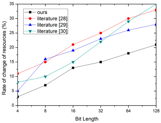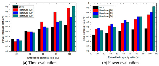 In the proposed scheme, original identification data is encrypted using a hash function that compresses data into a message with the length of 128 bits, and the message is inserted into the design after being divided into a few fragments next. In this experiment, the power and time are evaluated with the increase of inserting identification data from 4 bits to 128 bits. The resource overhead is shown in Figure 7, where Figure 7a shows the time increase rate and Figure 7b the power increase ratio. With the increase of the embedded capacity ratio, the overhead curves of the three schemes are ascending, so the increase in time and power for the proposed scheme is the minimum (indicated as “ours”).