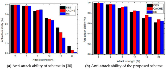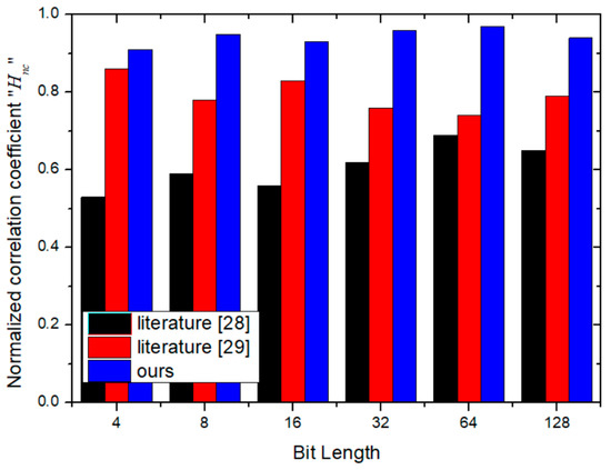 In (21), f1 and f2 denote the inserted and the extracted identification data respectively, also M and N are respectively the bit lengths of both identification data. In the ideal case, the normalization parameter Hnc = 1. As shown in Figure 10 and Figure 11, with the increase of the bit length, the HSab and Hnc are larger than that of the similar schemes, which demonstrates the excellent performance of the proposed scheme.