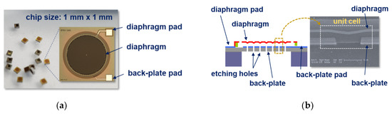 A capacitive MEMS acoustic sensor operates on the principle of capacitance variation interacted with the pressure of the incident acoustic wave. A flexible diaphragm detecting an input acoustic signal allows the sensor to be specific to a capacitive senor. Considering the sensitivity requirements for IoT, the diaphragm has a diameter of 500 μm to 1000 μm and a thickness of approximately a few micrometers. The fixed electrode used as the lower electrode is arranged at air gap of 20 to 50% of the total area of the uniformly arranged etching holes in order to maintain the dynamic reaction of the diaphragm. Here, in general, the fixed electrode and the diaphragm are maintained at a few µm in air space. Figure 1a shows the MEMS acoustic sensor with the area of 1 mm × 1 mm [9], and Figure 1b describes the cross-sectional structure for a capacitor and the concept of a unit cell, where the SEM image shows the etched hole and the membrane fabricated on top of it with a certain space. The bottom electrode with etching holes was made of a SiO2/Si3N4 insulator/Al metal/a SiO2 insulator and the top was composed of TiN/PECVD-Si3N4/TiN multi layers. Air gap between the fixed electrode and the moving electrode was implemented by forming a polyimide sacrificial layer between the two electrodes and then removing it by O2 etching method.