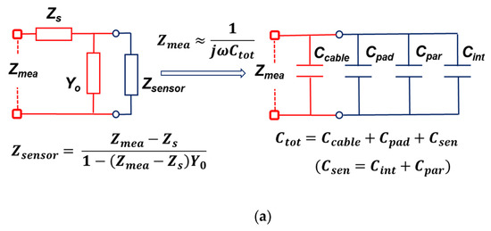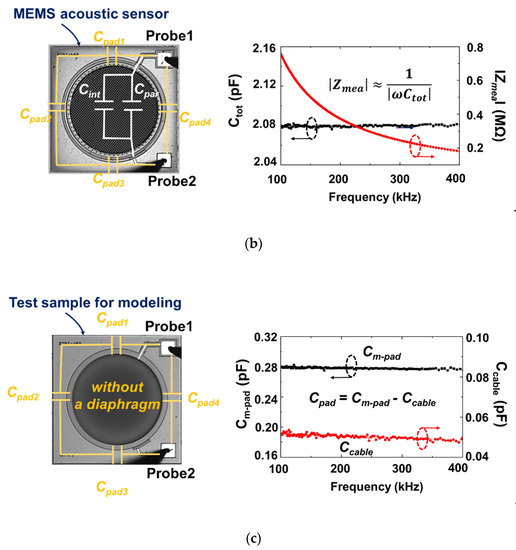 (a) The original circuit including the probe effect and the approximately circuit only consisting of capacitances; (b) structure-based circuit of capacitance for a capacitive MEMS acoustic sensor and its impedance measurement results; (c) structure-based circuit of capacitance for a sensor chip only containing the pad area and its impedance measurement results.