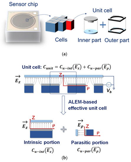 (a) Diagram of a capacitive MEMS acoustic sensor composed of unit cells; (b) diagram for the capacitive acoustic sensor roughly divided into an intrinsic and a parasitic component by the ALEM model.