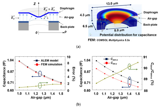 To verify the analytical ALEM-based model, an FEM simulation was performed using a commercial simulator (COMSOL Multiphysics 5.3 a). Figure 4a shows the conceptual diagram of the capacitive MEMS acoustic sensor unit cell and the simulated electric field distribution. At electrode spacing from 1.0 to 1.5 μm, the modeled capacitance was in good agreement with the FEM simulation, with a unit cell radius of 6.5 μm and an etch hole radius of 4.0 μm. The modeled capacitance was 0.71 fF at 1.5 μm and 1.04 fF at 1.0 μm gap, which was the deviation of 1.7% at the 1.5 μm electrode spacing and 0.8% at the 1.0 μm electrode spacing compared to those of the FEM simulation. This analytical model proved its validity because it has error within 2% when compared with FEM simulation result.
