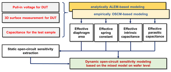 The modeling flow chart is illustrated in Figure 5. First, we measure the C-V of the device under test (DUT) with an impedance analyzer to obtain the total capacitance and pull-in voltage. Then, the height of the membrane with respect to the fixed electrode of the DUT is measured by using a surface analyzer. Next, the capacitance of the test sample is extracted by an impedance analyzer to extract the parasitic capacitance of the pad region. When the measurement is complete, we extract the intrinsic component from the active area with the ALEM model. Also, the capacitance value of the pad region is extracted with the OSCM model. Next, we model the effective diaphragm area and effective residual stress when the capacitance value of the entire sensor chip is extracted with two models. In addition, we model the static open-circuit sensitivity with the modeled effective parameters. The attenuation coefficient and electrode spacing can be calculated using the ALEM model. Finally, we obtain dynamic open-circuit sensitivity with empirical or theoretical concentration variables that make up the electrical equivalent circuit. Here, the conversion area can be obtained through the modeled static open-circuit sensitivity.
