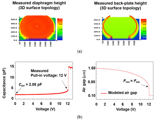 (a) Diaphragm and back-plate height of capacitive MEMS acoustic sensor measured by 3D surface analyzer; (b) the pull-in voltage according to the capacitance-voltage measurement and the air gap on the applied voltage of a modeled capacitive MEMS acoustic sensor; (c) modelled sensor chip capacitances, active area capacitances, intrinsic capacitance for the air gap and the intrinsic component ratio of the sensor chip to the air gap and the intrinsic component ratio of the active capacitance.