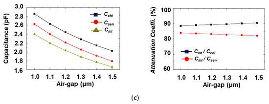 In addition, the attenuation coefficient (Cint-u/Csen-u) representing the ratio of the intrinsic component among the total capacitances was investigated in the modeled unit cell. As shown in Figure 4b, the attenuation coefficient was 90.4% at 1.5 μm electrode spacing and 88.6% at 1.0 μm spacing. These results show that the intrinsic component ratio is reduced by about 10% in the entire active region capacitance due to the etching holes. Therefore, the accurate attenuation factor must be properly reflected for open-circuit sensitivity extraction.