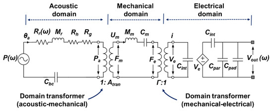 The electrical equivalent circuit consisting of three (acoustic-, mechanical-, and electrical-domain) regions for dynamic open-circuit sensitivity of a capacitive MEMS acoustic sensor.