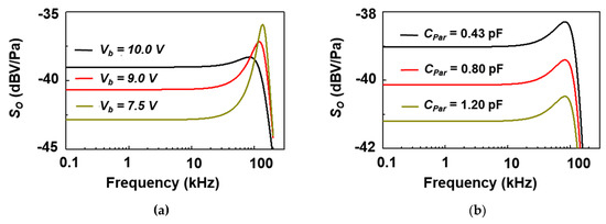 (a) Modelled dynamic open-circuit sensitivities based on bias voltages (7.5 V, 9.0 V, 10.0 V) of a capacitive MEMS acoustic sensor; (b) modelled dynamic open circuit sensitivities according to parasitic capacitances (0.43 pF, 0.80 pF, 1.20 pF) at 10.0 V bias condition of a capacitive MEMS acoustic sensor.