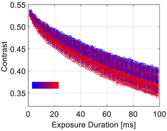 Figure 3a shows the contrast at an exposure duration of 98 ms as a function of apple firmness. A negative correlation between the two variables is observed, mainly showing a lesser
