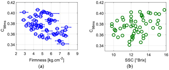 C98ms and firmness is −0.43. This value is significant, taking into account the unknown origin of the studied fruits, and the fact that all apples were taken into account when calculating the correlation, even those that had a high firmness standard deviation. The correlation is increased to −0.58 when considering