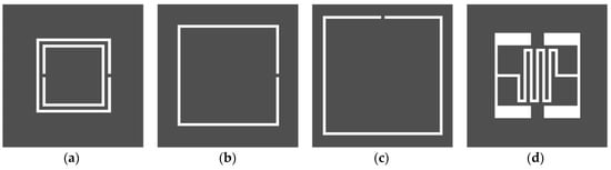 Figure 1. Four different resonator shapes considered for sensitivity comparison: (a) double-ring complementary split ring resonator (DR-CSRR); (b) single-ring complementary split ring resonator (SR-CSRR); (c) rotated single-ring complementary split ring resonator (R-SR-CSRR); (d) interdigital-capacitor-shaped defected ground structure (IDCS-DGS).