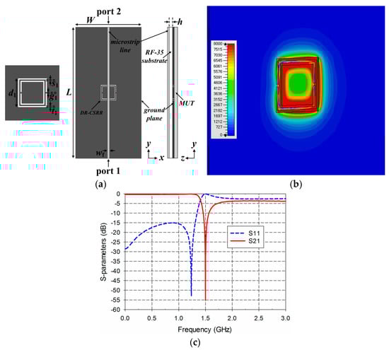 Figure 2. DR-CSRR-based permittivity sensor: (a) structure; (b) electric-field distribution at 1.5 GHz; (c) S-parameter characteristics.