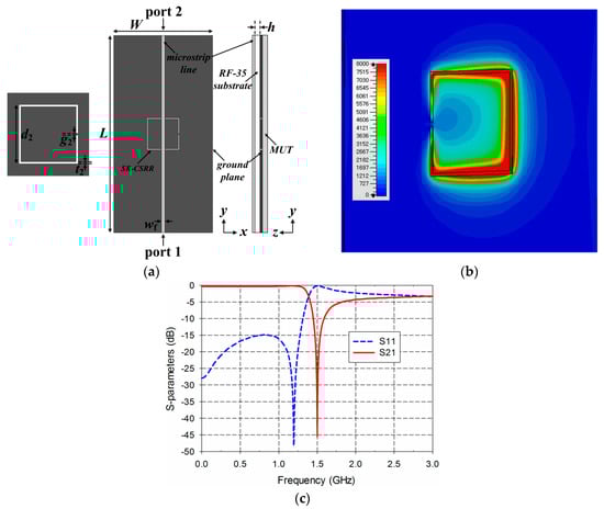 Figure 4. R-SR-CSRR-based permittivity sensor: (a) structure; (b) electric-field distribution at 1.5 GHz; (c) S-parameter characteristics.