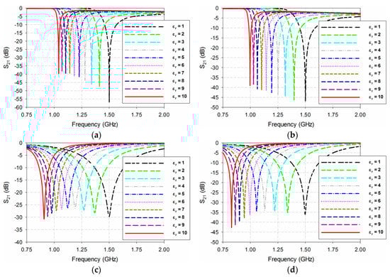 Figure 6. S21 characteristics of the four permittivity sensors for the varying permittivity of the material under test (MUT): (a) DR-CSRR; (b) SR-CSRR; (c) R-SR-CSRR; (d) proposed IDCS-DGS.