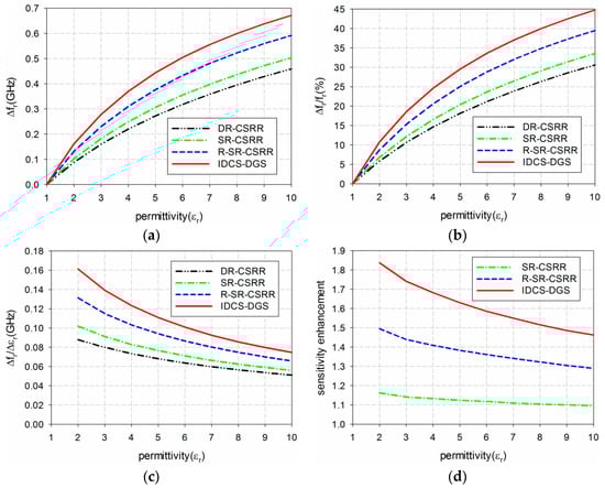 Figure 11 compares the sensitivity of the four permittivity sensors when five MUTs are loaded. When TLY-5A (εr = 2.17) was used as the MUT, the resonant frequency shifts Δfr of the DR-CSRR, SR-CSRR, R-SR-CSRR, and proposed sensors were 0.101 GHz, 0.116 GHz, 0.149 GHz, and 0.183 GHz, and the percent relative frequency shifts Δfr/fr_unloaded (%) were 6.8%, 7.8%, 10.0%, and 12.3%, respectively. The sensitivities of the DR-CSRR, SR-CSRR, R-SR-CSRR, and proposed IDCS-DGS-based sensors were 0.087 GHz, 0.099 GHz, 0.128 GHz, and 0.157 GHz. The sensitivity enhancements of the SR-CSRR, R-SR-CSRR, and proposed IDCS-DGS-based sensors were 1.15, 1.47, and 1.81 compared to the DR-CSRR-based sensor. When RF-10 (εr = 10.2) was used as the MUT, the respective Δfr values were 0.461 GHz, 0.506 GHz, 0.595 GHz, and 0.677 GHz, and the values of Δfr/fr_unloaded (%) were 30.8%, 33.8%, 39.7%, and 45.2%. The sensitivities of the DR-CSRR, SR-CSRR, R-SR-CSRR, and proposed IDCS-DGS-based sensors were 0.050 GHz, 0.055 GHz, 0.065 GHz, and 0.074 GHz. The sensitivity enhancements of the SR-CSRR, R-SR-CSRR, and proposed IDCS-DGS-based sensors were 1.10, 1.29, and 1.47 compared to the DR-CSRR-based sensor. Therefore, the trends of Δfr, Δfr/fr_unloaded (%), sensitivity, and sensitivity enhancement were similar to those of the lossless case in Figure 6, and the only difference was the loss tangent. Since the loss tangent of the MUT mainly influences the magnitude level and quality factor of the S21 characteristics of the sensors [22] and the loss tangent of the MUTs is relatively low—ranging from 0.0009 to 0.0035—, the effect of the loss tangent on the S21 resonant frequencies would be relatively insignificant.