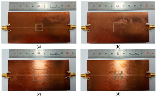 Figure 8. Photographs of the fabricated permittivity sensors: (a) DR-CSRR; (b) SR-CSRR; (c) R-SR-CSRR; (d) proposed IDCS-DGS.